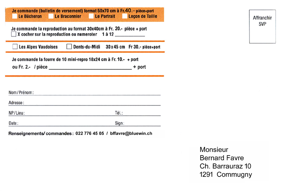 Vous pouvez aussi commander par téléphone au 022 776 45 05 (év. répondeur) ou par e-mail : bffavre@bluewin.ch
